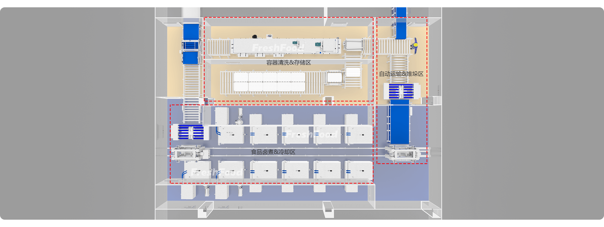 用于酱卤类食品(酱卤肉、素卤味等)的批量生产。物料运输、卤煮加工、快速冷却、容器清洗多功能一体化,全程自动化,可全天不间断生产。